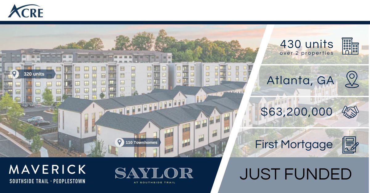 ACRE Credit recently provided a $63.2 million first mortgage bridge loan to a joint venture between RangeWater Real Estate and The Carlyle Group for the refinance of Maverick and Saylor at Southside, two separate newly constructed multifamily properties in the South Atlanta submarket of Atlanta, GA.